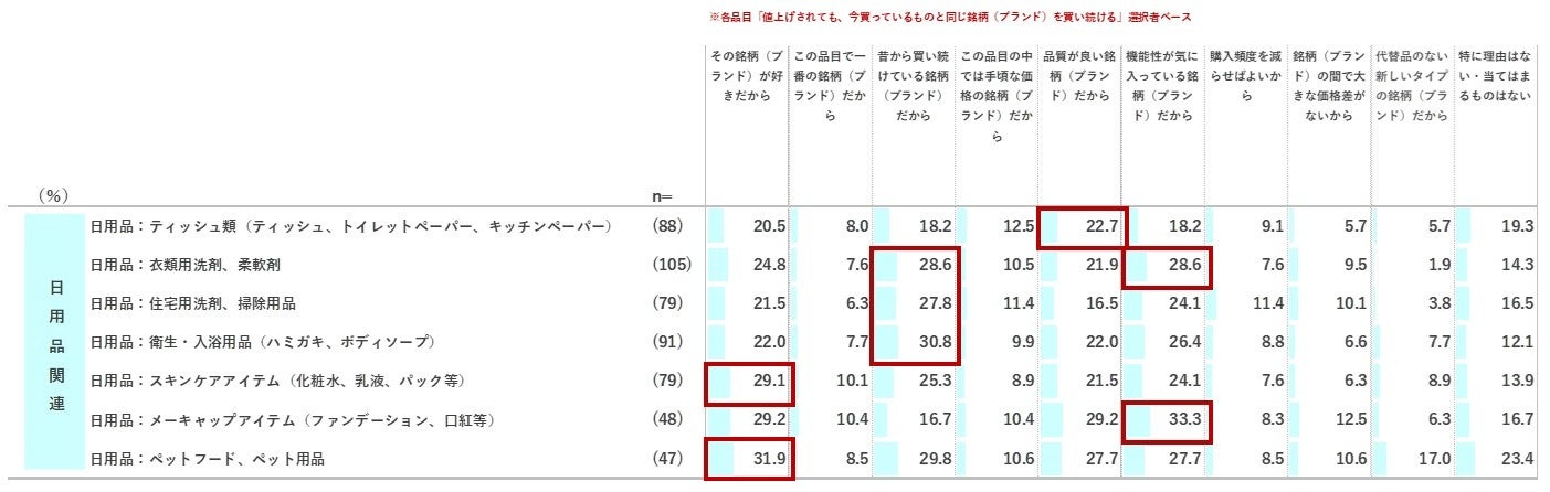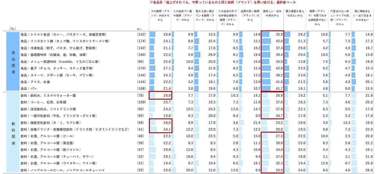 『値上げされても、今買っているものと同じ銘柄(ブランド)を買い続ける』と回答された人にその理由を確認すると、食品関連ではいずれの項目でも「美味しい・好みの味だから」が最も多い結果となり味が一番の重視ポイントとなっています。飲料関連では「美味しい・好みの味だから」を選択する項目が多いなかで、「機能性乳飲料(R-1、ラブレ等)」「栄養ドリンク・栄養補助飲料(ドリンク剤・ビタミンドリンクなど) 」は「その銘柄(ブランド)が好きだから」が多くなっており、味よりブランドが重視されている様子です。