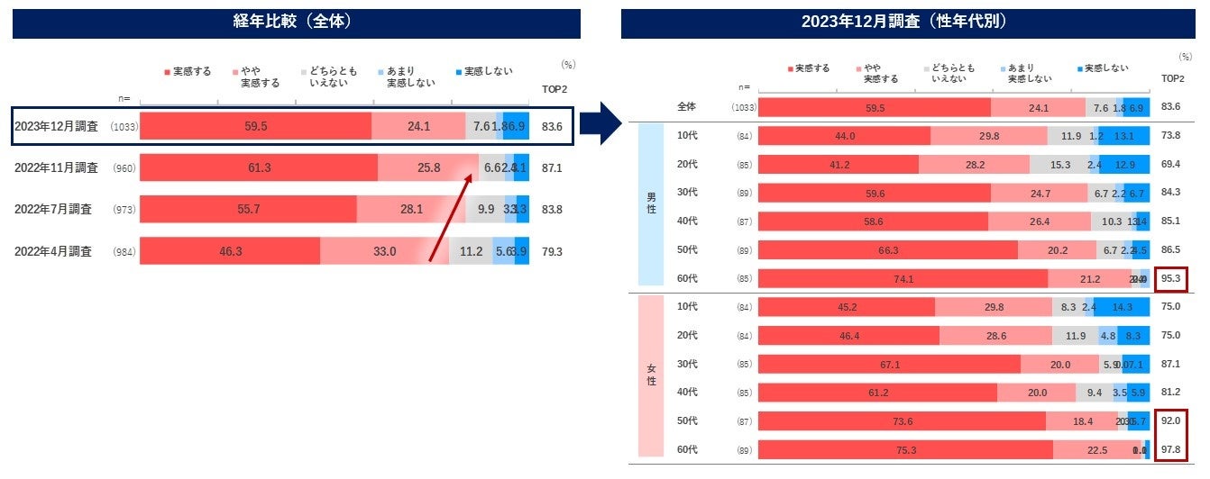 なお、男性60代、女性50代以上では「TOP2」(実感する+やや実感する)が9割を超える結果となっており、他の層を上回っています。