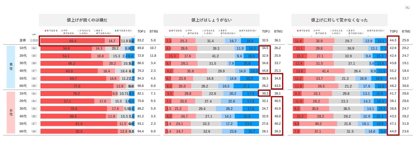 また、「値上げに対して驚かなくなった」かを確認したところ、いずれの性年代も「TOP2」(あてはまる+ややあてはまる)の割合が多く、相次ぐ値上げに慣れてきてしまっている様子です。