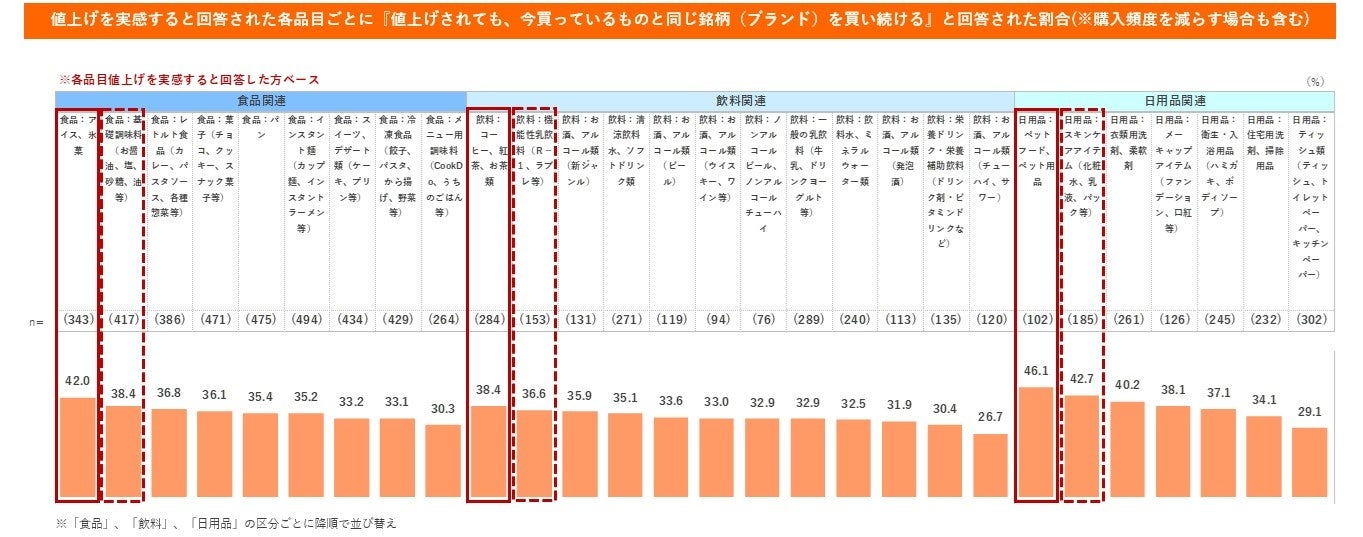 値上げを実感する品目について、『値上げされても、今買っているものと同じ銘柄(ブランド)を買い続ける』と回答された割合をみると、食品関連では「アイス、氷菓」が42.0%と最も高く、次に「基礎調味料(お醤油、塩、砂糖、油等)」が38.4%と続きます。飲料関連では「コーヒー、紅茶、お茶類」が38.4%と最も高く、次に「機能性乳飲料(R-1、ラブレ等)」が36.6%と続きます。日用品関連では「ペットフード、ペット用品」が46.1%と最も高く、次に「スキンケアアイテム(化粧水、乳液、パック等)」が42.7%と続きます。