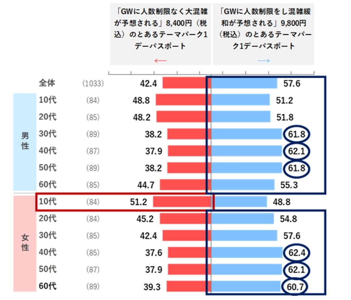 テーマパークなどで実施されている価格変動制を用いたチケットの価格設定について確認したところ、10代女性を除いて「人数制限をし混雑緩和が予想される9,800円(税込)の1デーパスポート」の割合が高く、特に男性30代~50代、女性40代~60代では6割に上っていました。若年層は混雑していても安さを求め、大人になると価格が高くなってでも混雑緩和されている快適さを求めるのではと考えられます。