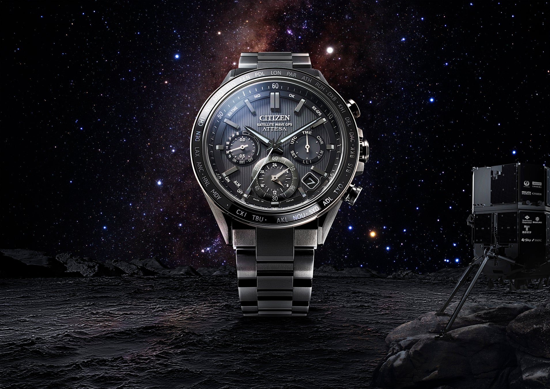 『シチズン アテッサ』ACT Lineは、ビジネススタイルの多様化を背景に、アクティブに働くビジネスマンに向けて、スーツスタイル、カジュアルなシーンのどちらでもマッチするデザイン要素を加えたラインナップです。『シチズン アテッサ』でも使用されているスーパーチタニウムTMは、民間月面探査プログラム「HAKUTO-R」のランダー(月着陸船)脚部パーツに採用されています。2022年末頃の打ち上げ※を目指し、これからも支援を行っていきます。 ※2022年9月時点の想定です。