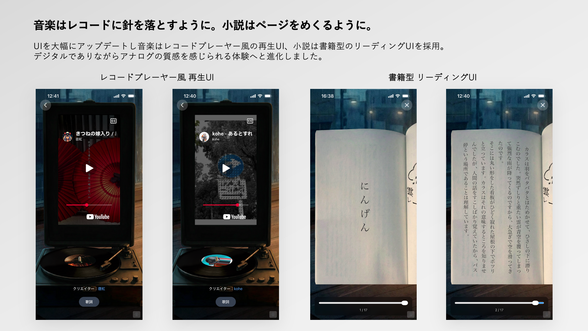 今回のアップデートでは、UIを大規模にアップデートし、作品の世界観に深く入り込める没入型デザインを採用しました。音楽作品はレコードプレーヤーを模したインターフェースで動画とともに再生され、まるでアナログレコードに針を落とすような体験を提供します。小説作品は実際の書籍をめくるようなUIで読むことができ、紙の本を手に取るような親密さと没入感を演出します。