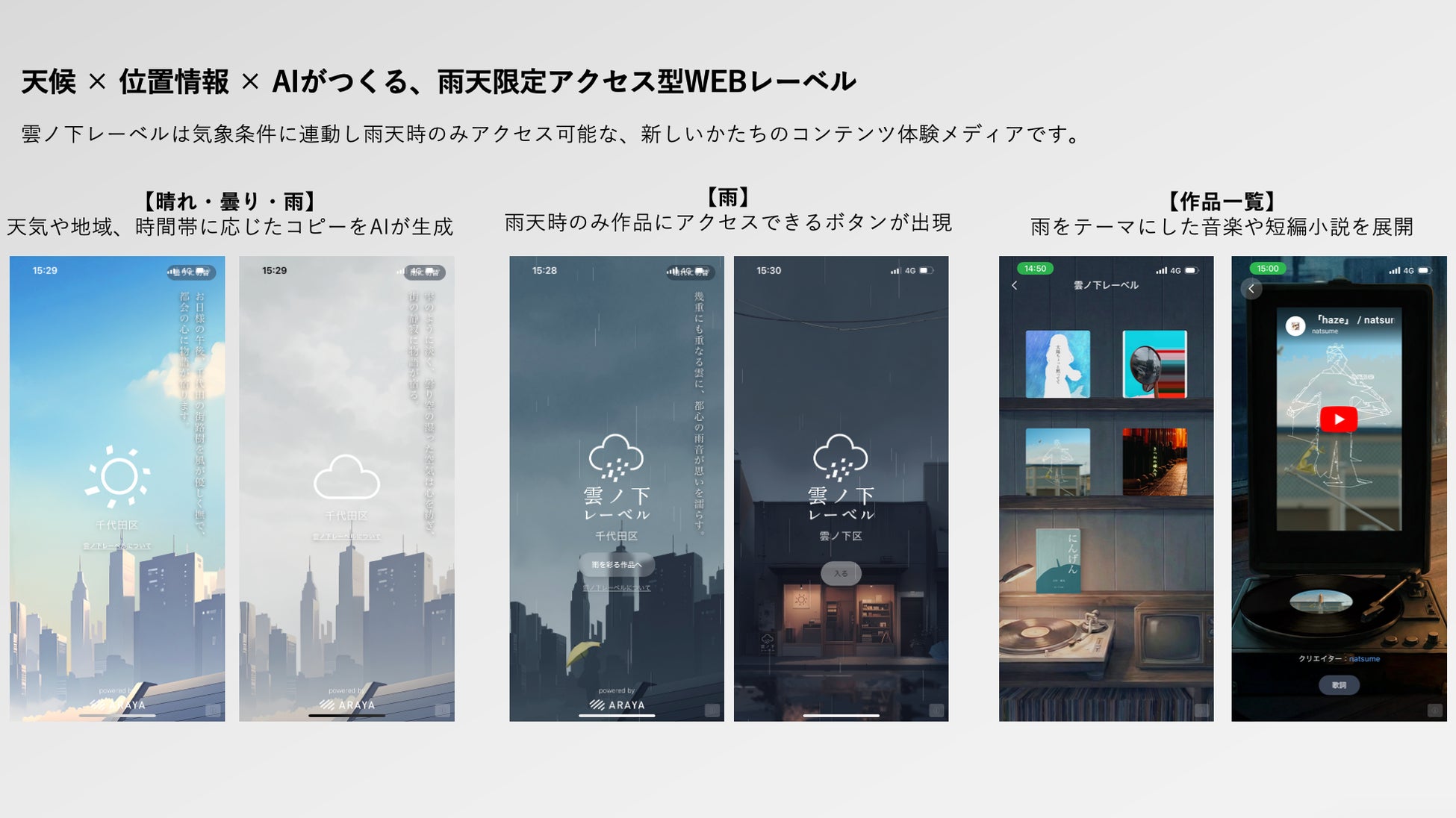 「雲ノ下レーベル」は、ユーザーの現在地に雨雲がかかっている時だけアクセスできるWEBアプリです。気象APIによるリアルタイムの雨雲情報をもとに、雨天時にのみ音楽・小説・映像などの作品が解放されます。日々変わる空模様と人の感情のゆらぎをつなぎ、雨の日でしか出会えない物語体験を提供する「気象と感情の詩的体験メディア」です。