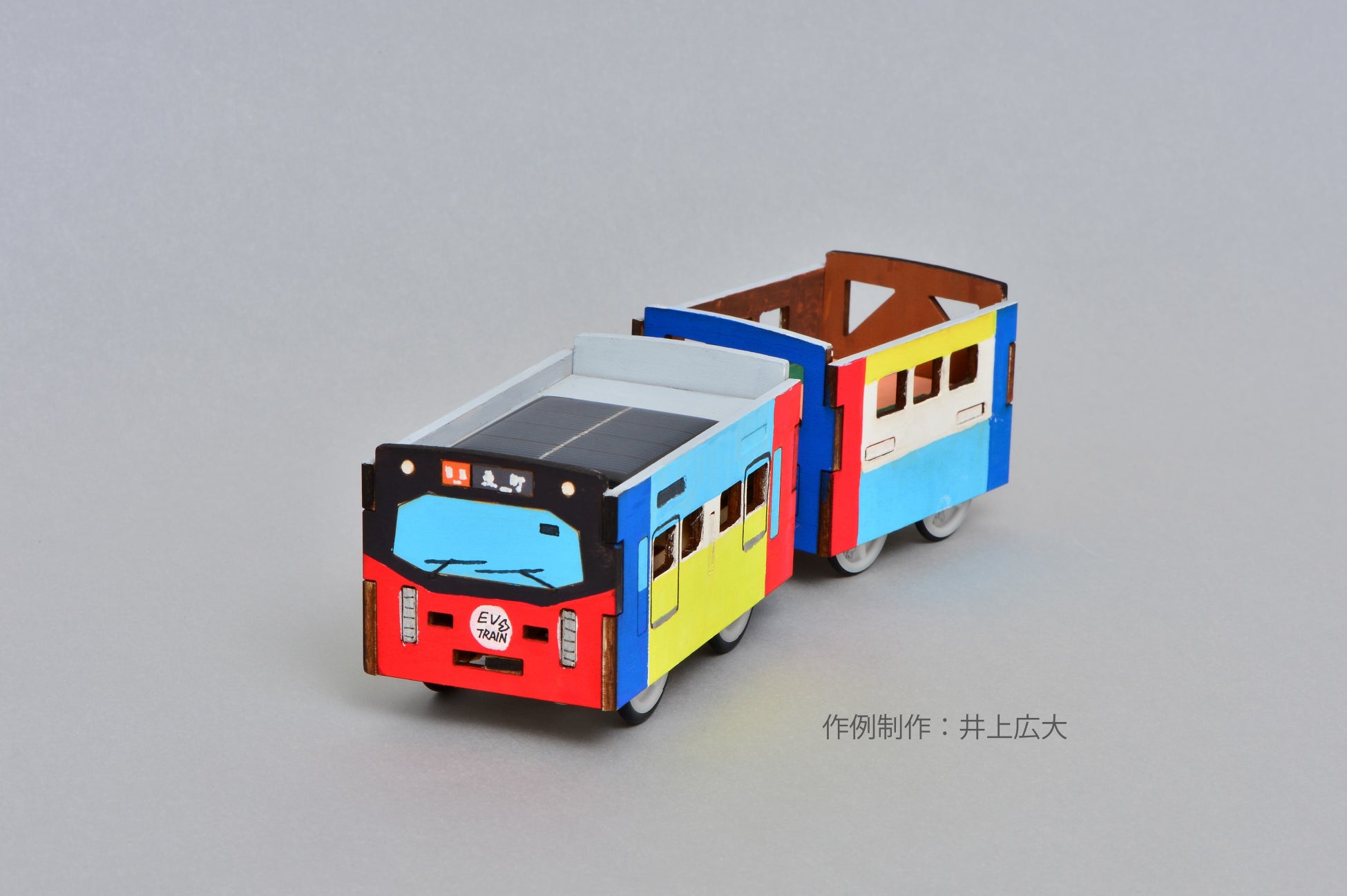 木のパーツを組み立てて、2両編成の“ソーラーでんしゃ”が作れるキットです。