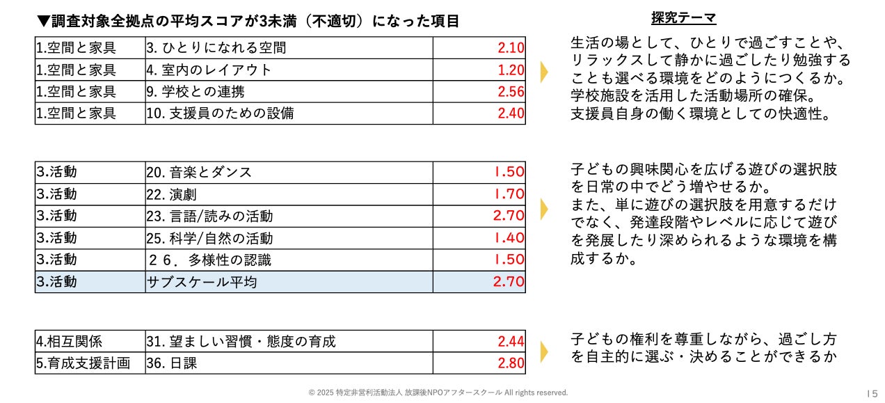 調査では、SACERSを用いて、放課後の居場所を「空間」「活動」「人との関わり」など多角的に評価。その結果、どの拠点でも共通してスコアが低かった項目が浮かび上がり、改善の方向性が具体的に見えてきました。特に以下の観点は、SACERSの評価で「最低限の水準(3.0)」を下回った項目であり、全拠点に共通する改善課題として明確になりました。