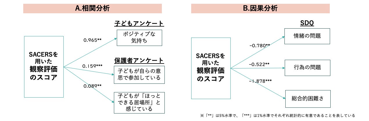 統計分析の結果、SACERSのスコアと子どもの感情や行動には次のような関係が確認されました。