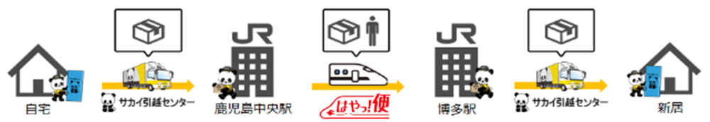 サカイ引越センタースタッフがお客さまのご自宅から、JR博多駅(またはJR鹿児島中央駅)までトラックで輸送を行います。JR博多駅からJR鹿児島中央駅間は、新幹線荷物輸送サービス「はやっ!便」でお客さまの大切なご家財を新幹線で輸送します。JR鹿児島中央駅(またはJR博多駅)到着後は、再びサカイ引越センタースタッフがお客さまの新居までご家財を輸送します。