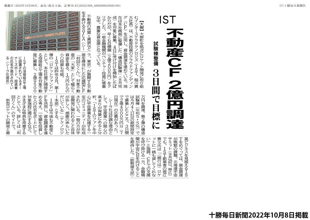「不動産CF2億円調達 試験棟整備 3日間で目標に IST」(十勝毎日新聞 紙面切り抜き)