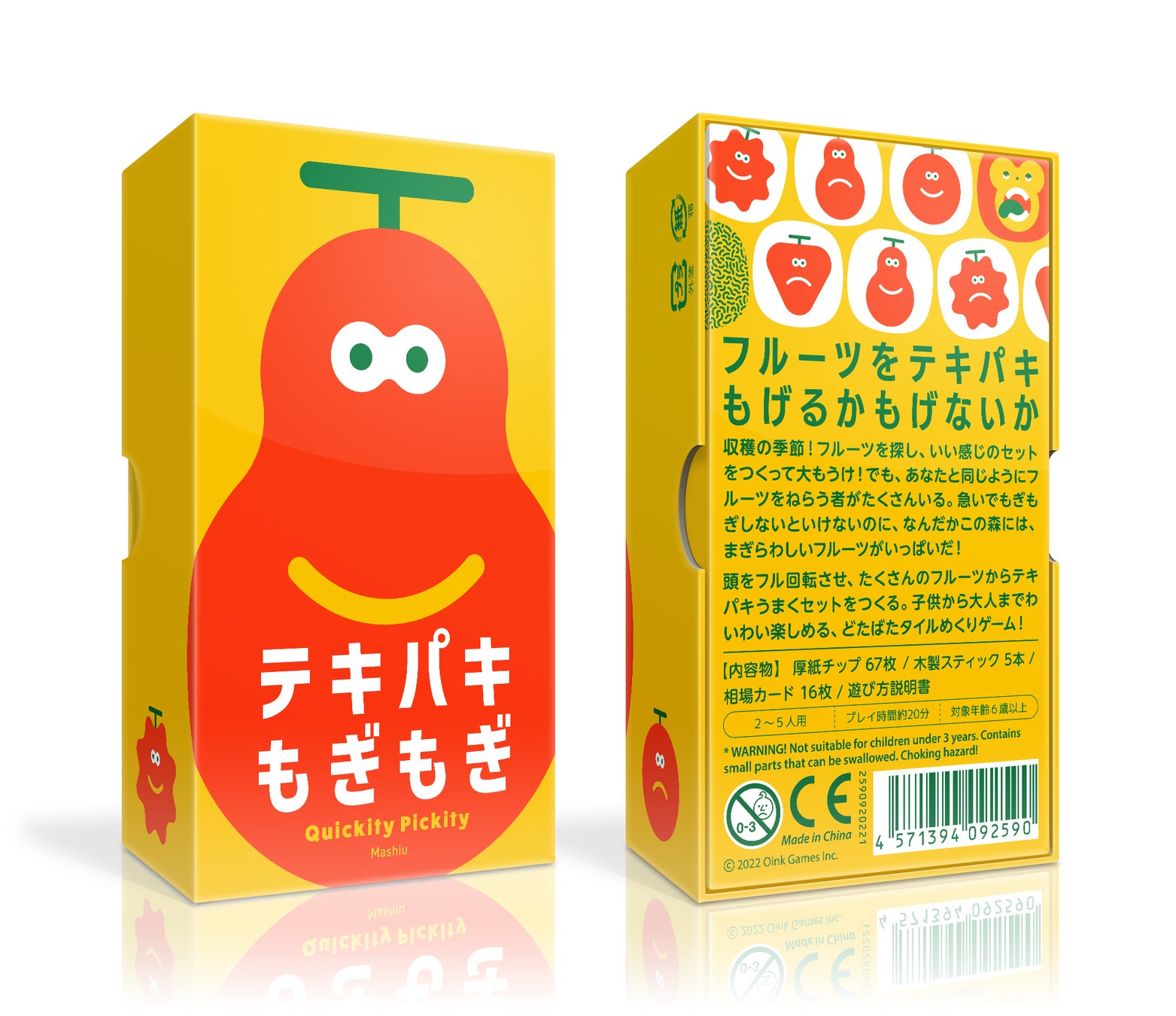 オインクゲームズは新作ボードゲーム『テキパキもぎもぎ』をゲームマーケット2022秋で発売します。頭をフル回転させ、たくさんのフルーツからテキパキうまくセットを作ろう。子供から大人までわいわい楽しめる、どたばたタイルめくりゲーム!