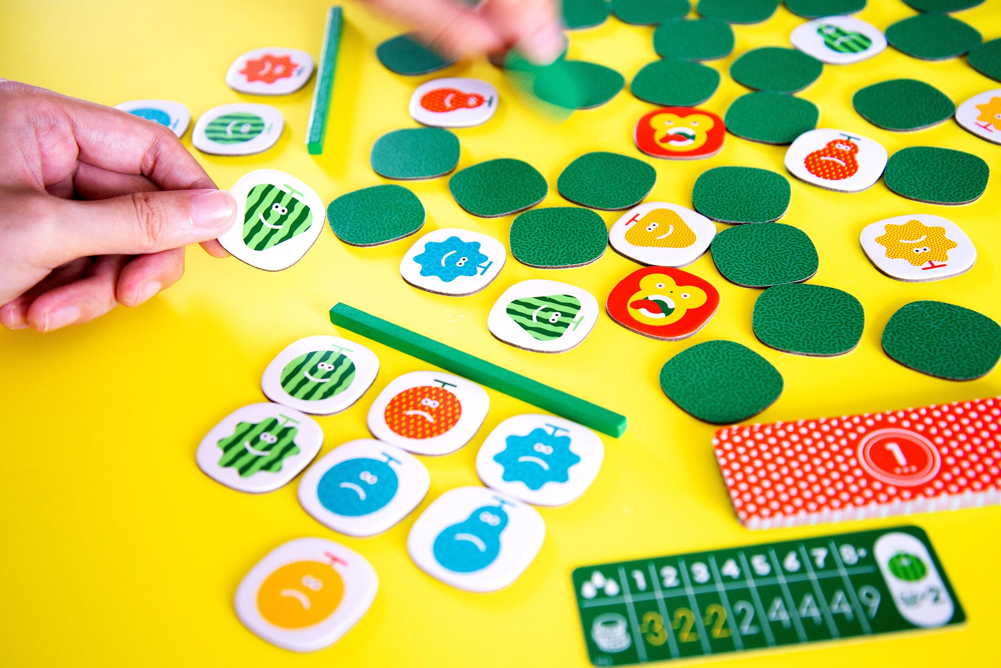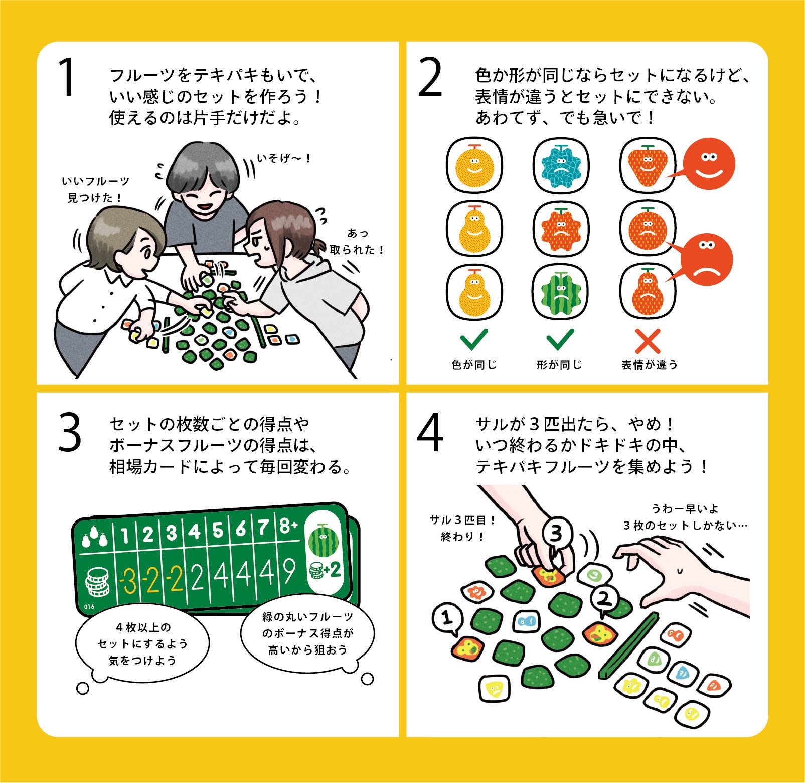 頭をフル回転させ、たくさんのフルーツからテキパキうまくセットをつくる。子供から大人までわいわい楽しめる、どたばたタイルめくりゲーム!