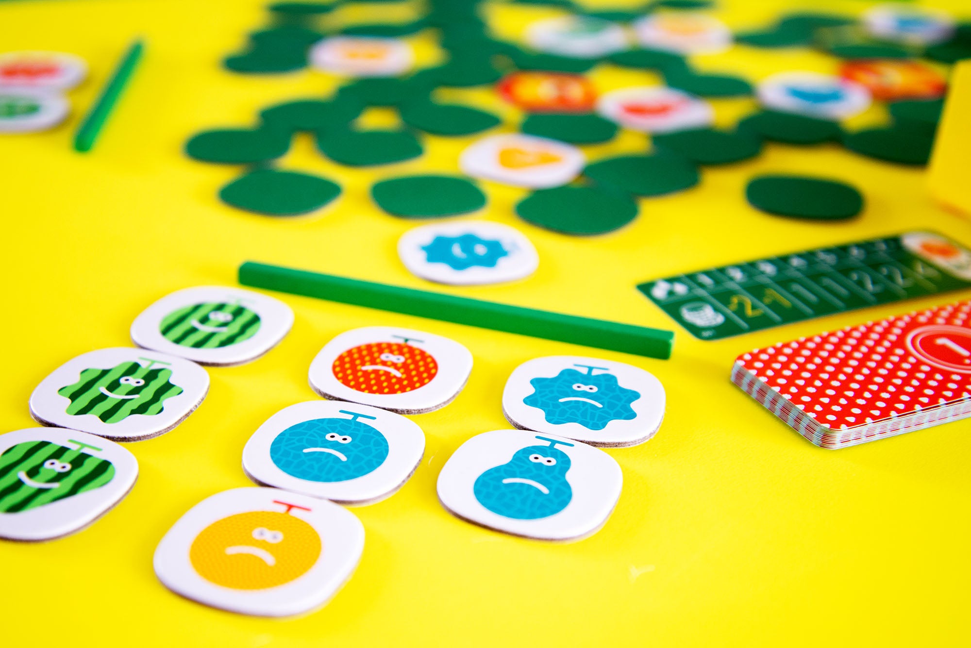 『テキパキもぎもぎ』は、テキパキと手と頭を働かす、どたばたタイルめくりゲーム。よーいドンで一斉にタイルをめくり、色か形が同じフルーツをセットにします。フルーツの中に隠れたサルがゲームを終わらせる前に、テキパキと集めなければいけませんが、紛らわしいフルーツをしっかり見分けないと、高得点のセットにはなりません。子供から大人までわいわい楽しめる、ゲーム初心者の方にもおすすめのゲームです。
