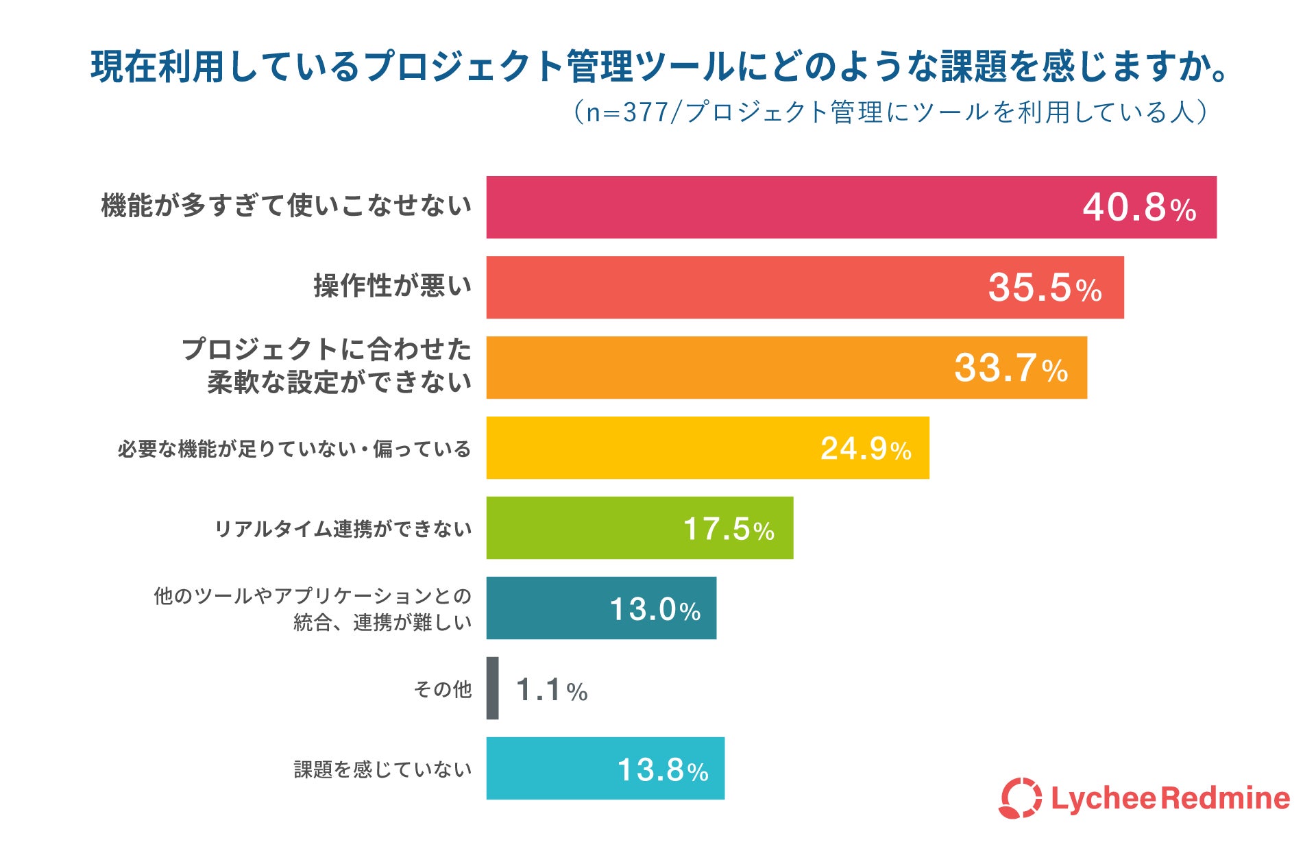 現在利用しているプロジェクト管理ツールにどのような課題を感じるか尋ねたところ、「機能が多すぎて使いこなせない」が40.8%で最も多く、「操作性が悪い」が35.5%、「プロジェクトに合わせた柔軟な設定ができない」が33.7%と続きました(n=377/プロジェクト管理にツールを利用している人)。