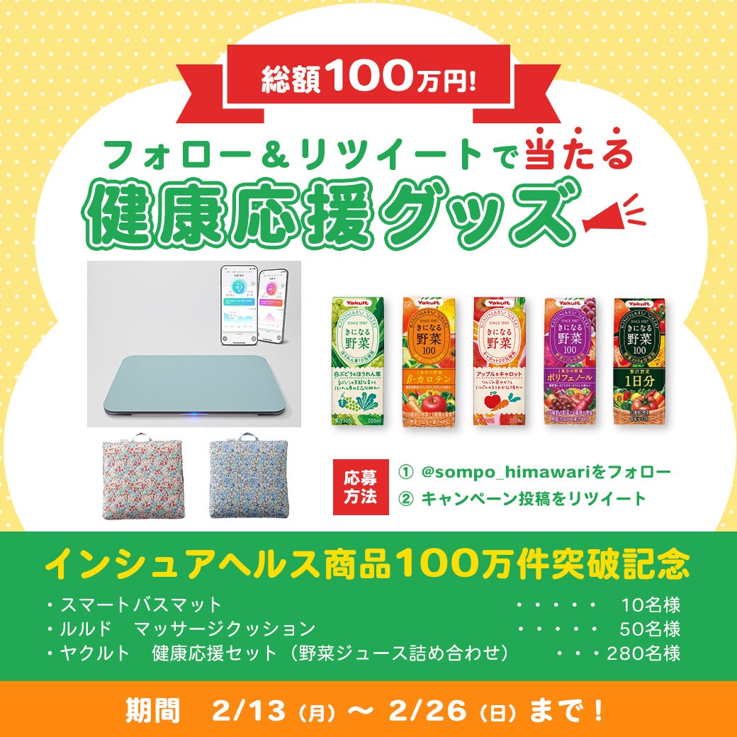 SOMPOひまわり生命保険株式会社(社長:大場 康弘、以下「当社」)は、2018年4月から提供を開始した、保険本来の機能(Insurance)に、健康をサポートする機能(Healthcare)を加えた「Insurhealth®(インシュアヘルス)」商品の累計販売件数が100万件を突破したことを記念し、2023年2月13日(月)から2023年2月26日(日)までの間、SOMPOひまわり生命保険株式会社公式Twitterアカウント(@sompo_himawari)をフォローし、対象の投稿をリツイートした方の中から抽選で、合計340名さまに総額100万円分の豪華健康応援賞品をプレゼントするキャンペーンを実施します。