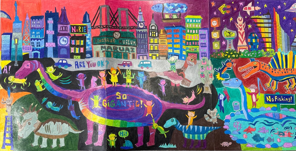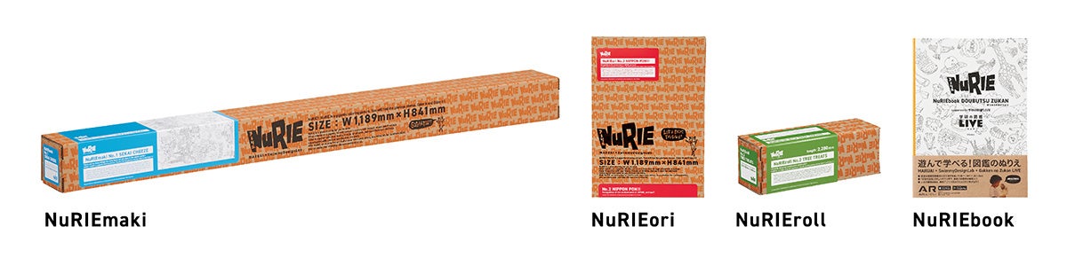 「NuRIE」はA0サイズの大きなものや2メートル以上の長いものなど、他にはない大きさが特徴のぬりえのシリーズです。絵柄は株式会社スイミーデザインラボのアートディレクター吉水卓氏が描いたもので、ユニークなタッチと絵柄に散りばめられた物語が家族や友達とのコミュニケーションを生み出します。