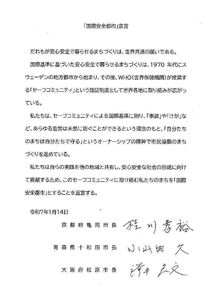 国内のセーフコミュニティ認証自治体と、「国際安全都市」宣言を令和7年1月14日に共同発表。宣言には、「自らの実践を他の地域と共有し、安心安全な社会の形成に向けて貢献する」などの内容を盛り込んでいます。