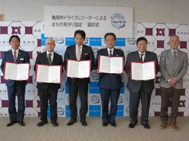 亀岡市内を走る自動車のドライブレコーダーを「動く防犯カメラ」として活用し、まちの見守り体制を強化する協定を締結。 これまでに31社と締結しており、協定締結事業所のドライブレコーダー搭載車台数は合計719台となっています。今後も、協定締結事業所を増やしていくとともに、市民の自家用車等を活用する『かめおか「まち・レコ」プロジェクト』と連携し、「まちの見守り体制」の強化を進めます。
