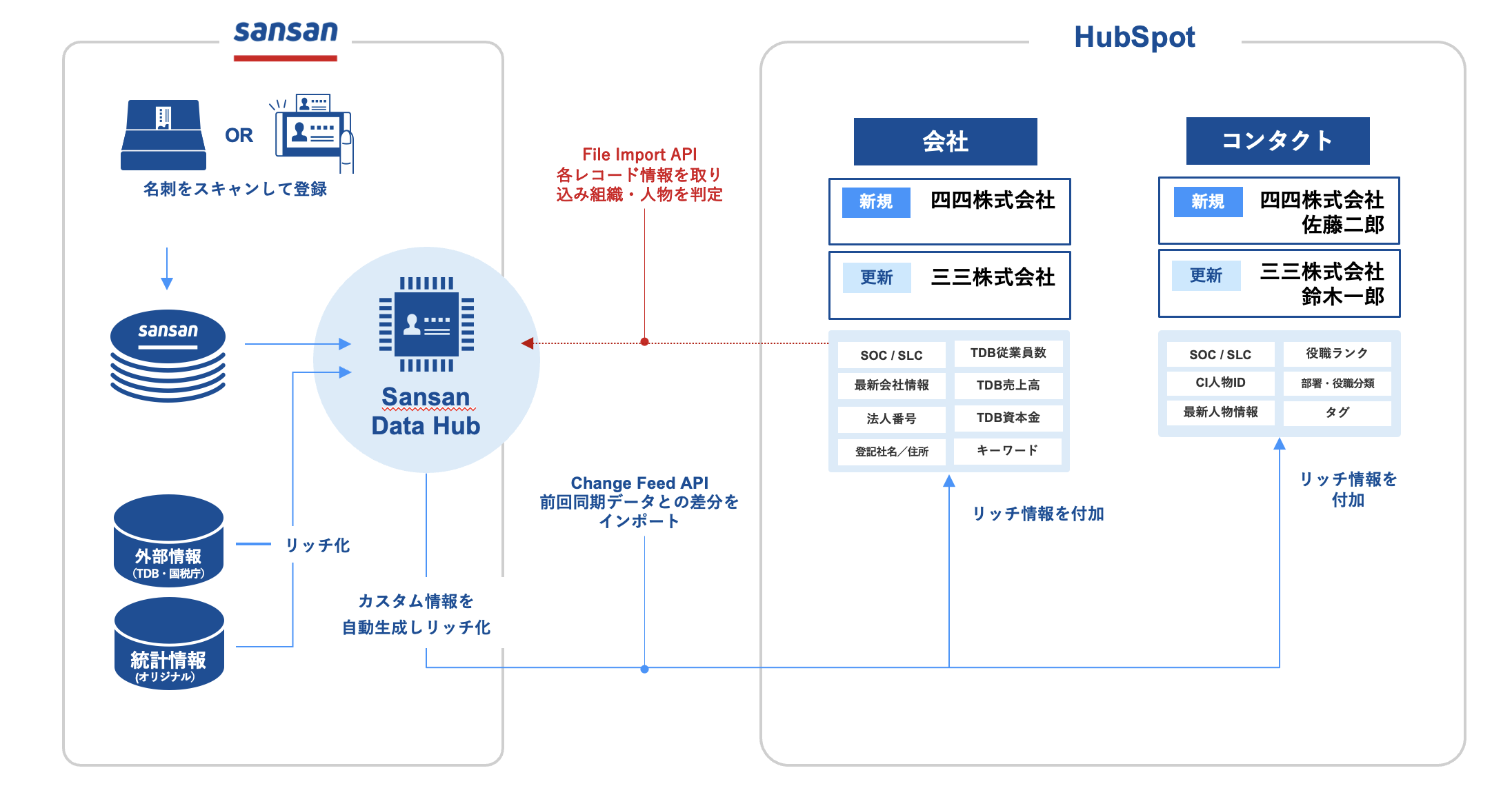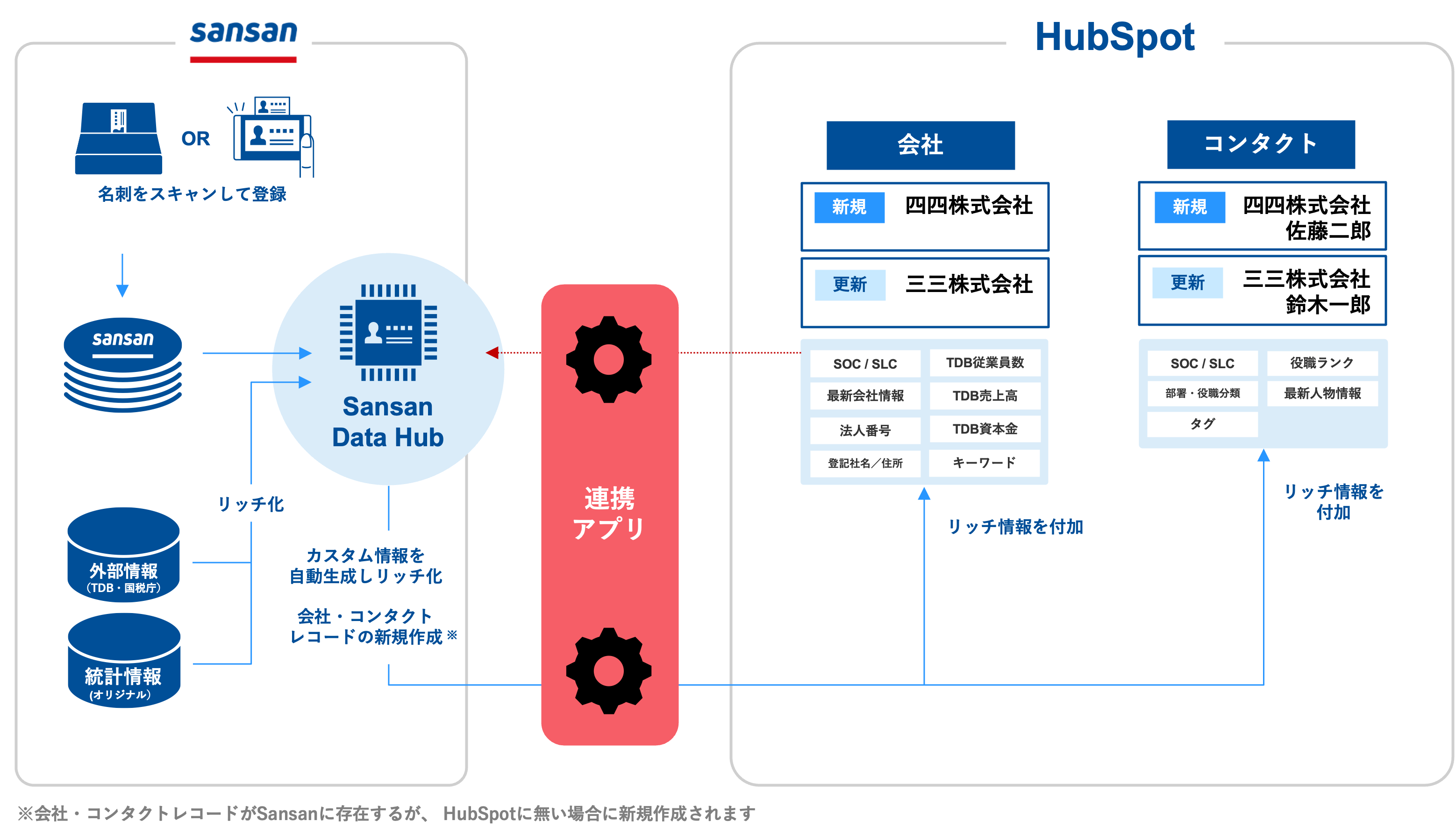 HubSpotに登録されたコンタクトは、Sansan Data Hubに取り込まれます。Sansanから連携された名刺情報に加え、Sansan Data Hub上の「帝国データバンク / 国税庁」や「Sansanオリジナル」の属性情報によってリッチ化されたデータは、HubSpotに自動インポートされ、会社とコンタクトレコードに付与されます。