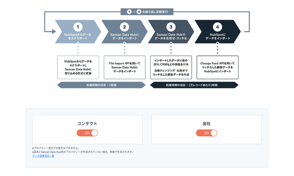 Sansan Data Hub連携アプリにより、Sansan Data Hub とHubSpot間で、自動的にデータのインポートとエクスポートが繰り返し実行されます。