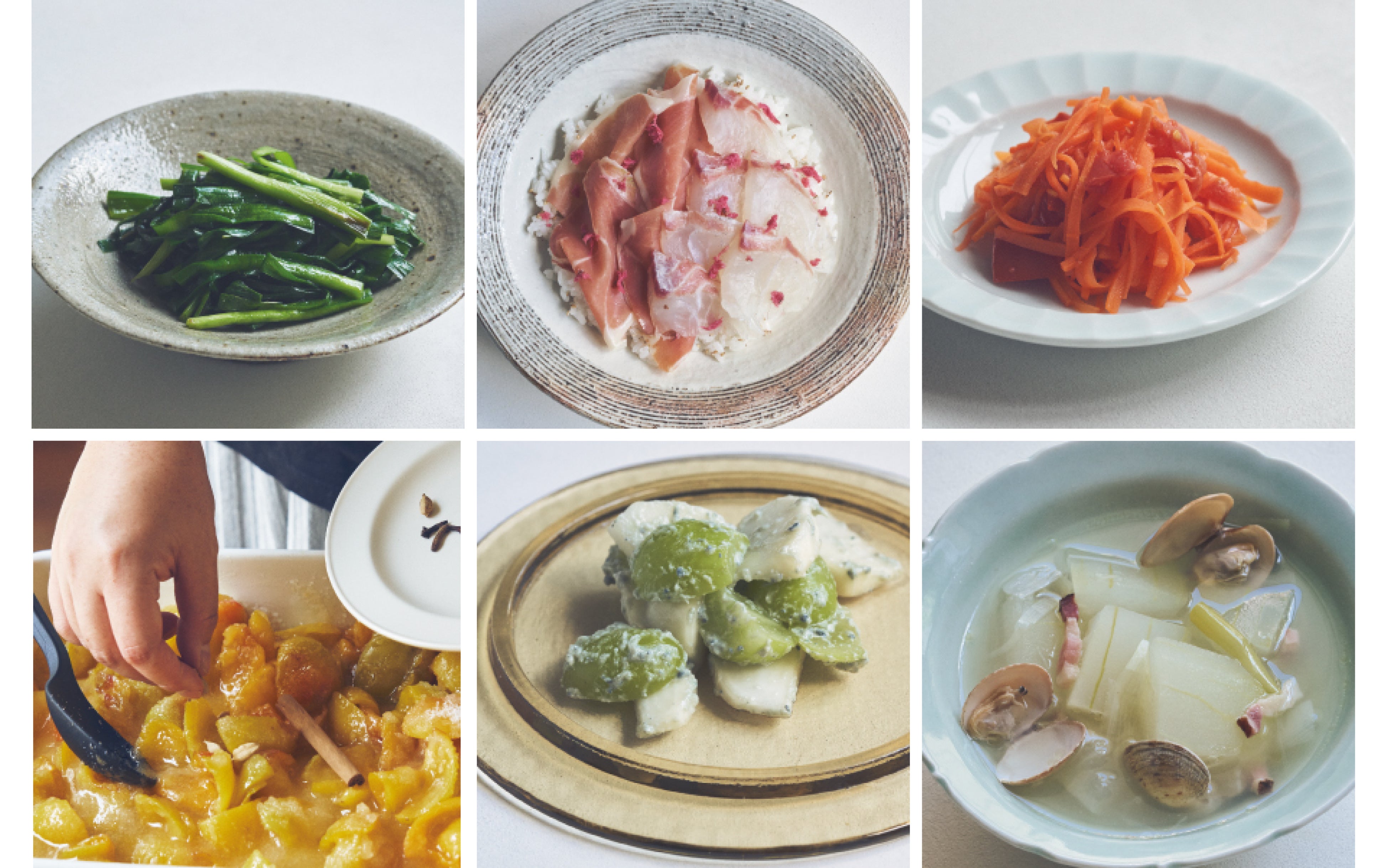 下・左から:完熟梅のスパイス砂糖漬け/シャインマスカットとブルーチーズのサラダ/冬瓜、パンチェッタ、あさり、生姜、葱のスープ