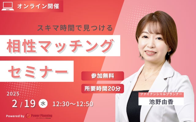 無料マネーセミナー提供サービス「アットセミナー」を運営しているパワープランニング株式会社が「2月19日(水) 12時30分」に「相性マッチングセミナー」というスキマ時間で自分に合ったFPを見つけられるオンラインセミナーを開催いたします。