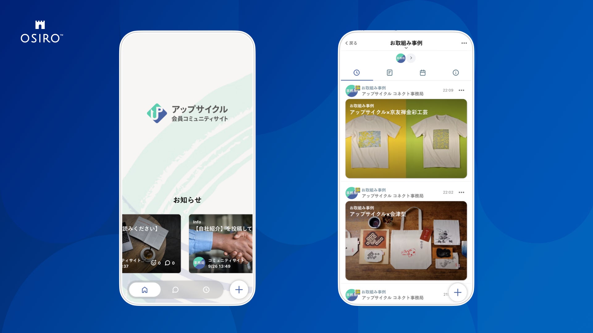 参画企業同士が保有する技術と知識を活用してより多くのプロジェクトを立ち上げ、循環型社会を推進するためには、参画企業同士のコミュニケーション活性化が重要になります。そのような共創の姿を実現するため、一般社団法人アップサイクルでは、双方向のコミュニケーション活性化を得意とするOSIROを導入し、「アップサイクル 会員コミュニティサイト」を開設しました。