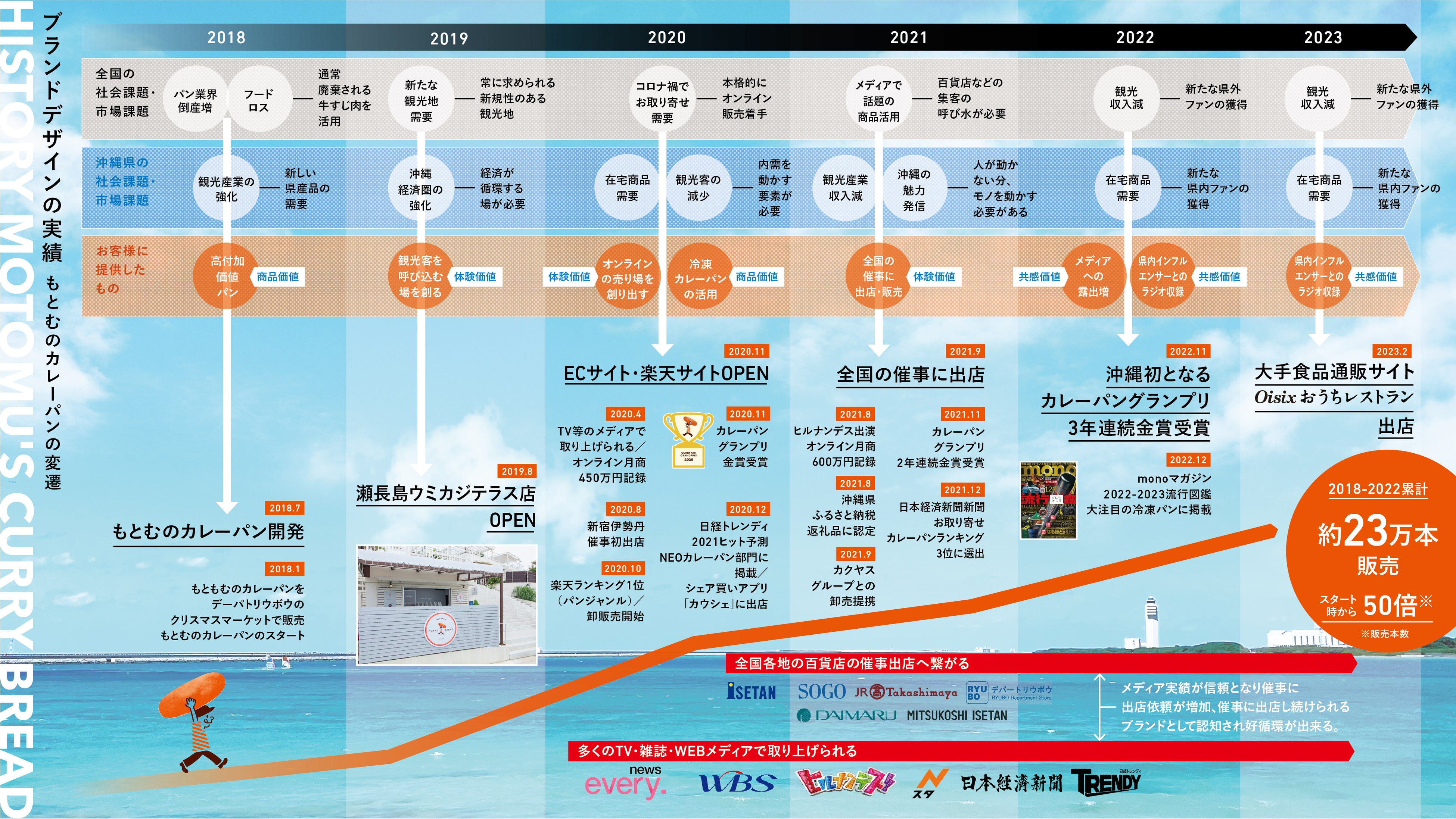 パン需要が増加していく中、主食というインフラを保持する重要性や、数あるパンの中でも絶対的なNo.1商品やメーカーが存在しない「カレーパン」というジャンルを発見したことで、一気にブランドポジションが鮮明となりました。ブランドデザインでは、まずは、女性やお子様でも食べやすい細長い形状を選択。そして、一度目にすると忘れない、ビビッドなオレンジをあしらったパッケージを自社で開発することでSNSでの話題化を実現。さらに、商品自体のストーリーとして、産地の付加価値を高めるために沖縄・瀬長島ウミカジテラスでの店舗出店を行うことで、沖縄の新たなソウルフードとして「もとむのカレーパン」のブランドの輪郭をはっきりさせました。