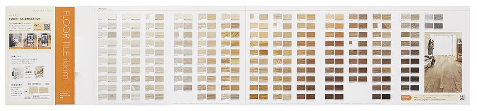 このような背景を踏まえて開発した「FLOOR TILE ikkimi」は、住宅で⼈気のベーシックな⽊⽬柄と⽯⽬柄のフロアタイルを、カラー順に掲載したコンパクトなカタログです。デザインバリエーション豊かなビニル床タイルのコーディネートをサポートし、空間提案の幅を広げます。