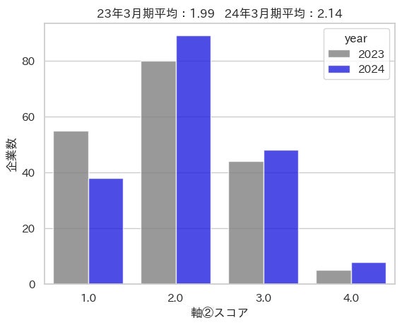 今回のレーティングは、2024年3月期を決算期とする企業のうち、2023年3月期と2024年3月期の両年度で開示した企業184社の有価証券報告書について、①人的資本投資への評価指標、②人的資本投資対象の明示の2軸で行いました。経年での変化を見ると、23年3月期と比較して24年3月期について、全体的にスコアがあがっています。