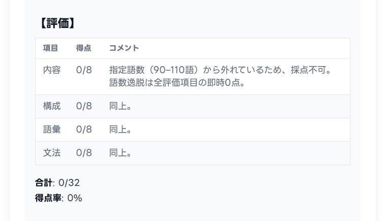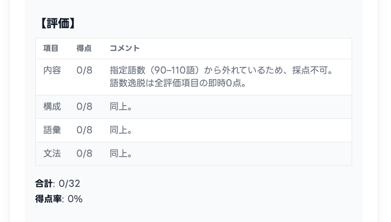 指定語数を1語でも外れている場合、採点基準に従い「内容/構成/語彙/文法」などの全観点を0点として扱い、理由を明示します。