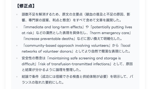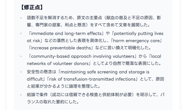 A. 本番で要件未達により大きく失点するリスクがある以上、練習段階で曖昧にせず、「語数を守ることを最優先で身につける」設計が必要だと判断しました。なお、語数逸脱で0点となった場合でも、次回改善につながるよう修正点・改善の方向性を提示します。