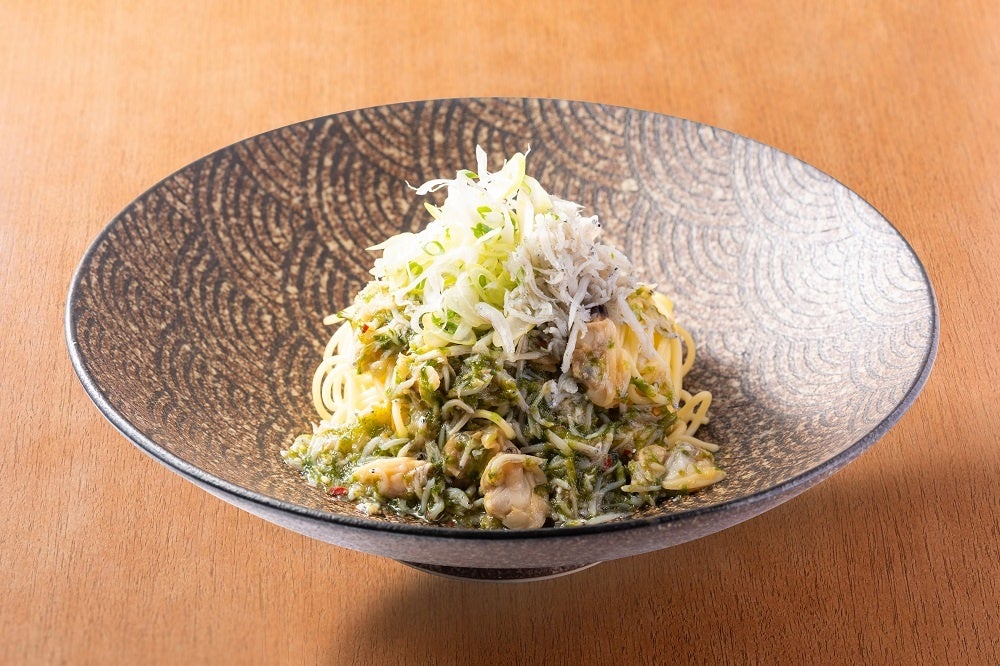 あさりと柚子胡椒のアクセントがくせになる、魚介の旨味たっぷりのピリ辛ペペロンチーノ。