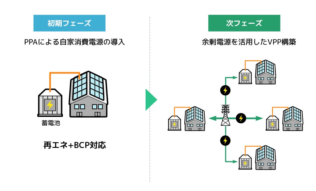 初期フェーズでは、PPAによる自家消費電源を導入し追加性のある再エネに切り替えられるだけでなく、蓄電池併設によって非常用電源を確保します。さらに、将来的にはより大規模な蓄電池を設置し、余剰電力を「ロジスクエア」シリーズにおいて相互に融通しあうVPP(※2)の実現を目指します。