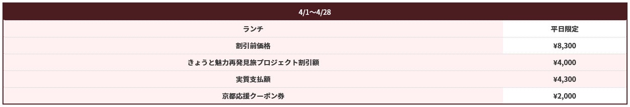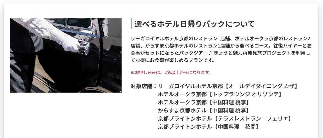 株式会社フォーティーズ(本社:大阪市鶴見区、代表取締役 岡武史)は4月28日迄延長になった「きょうと魅力再発見旅プロジェクト」の対象商品として京都ブライトンホテルのレストランと往復ハイヤーがセットになったパックツアーのオンライン販売を開始いたしました。