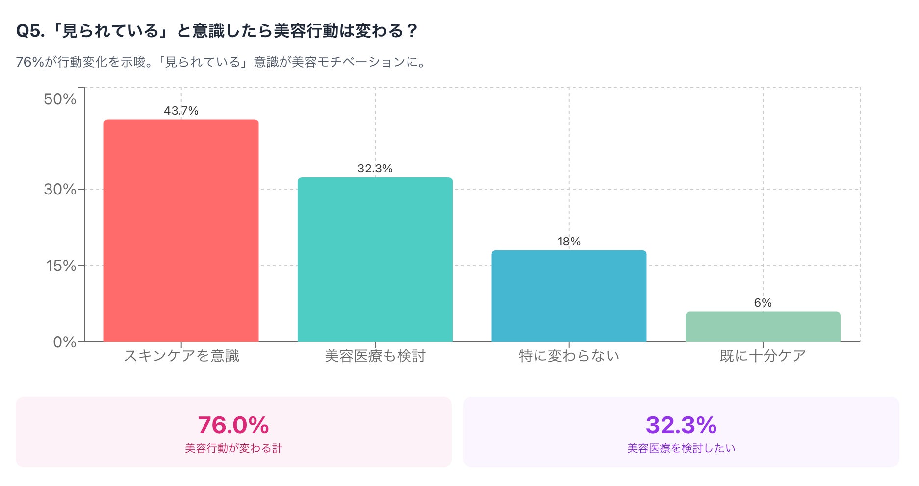 その結果、「スキンケアをより意識するようになる」(43.7%)、「美容医療も検討してみたい」(32.3%)と、合計76.0%の人が美容行動の変化を示唆しました。