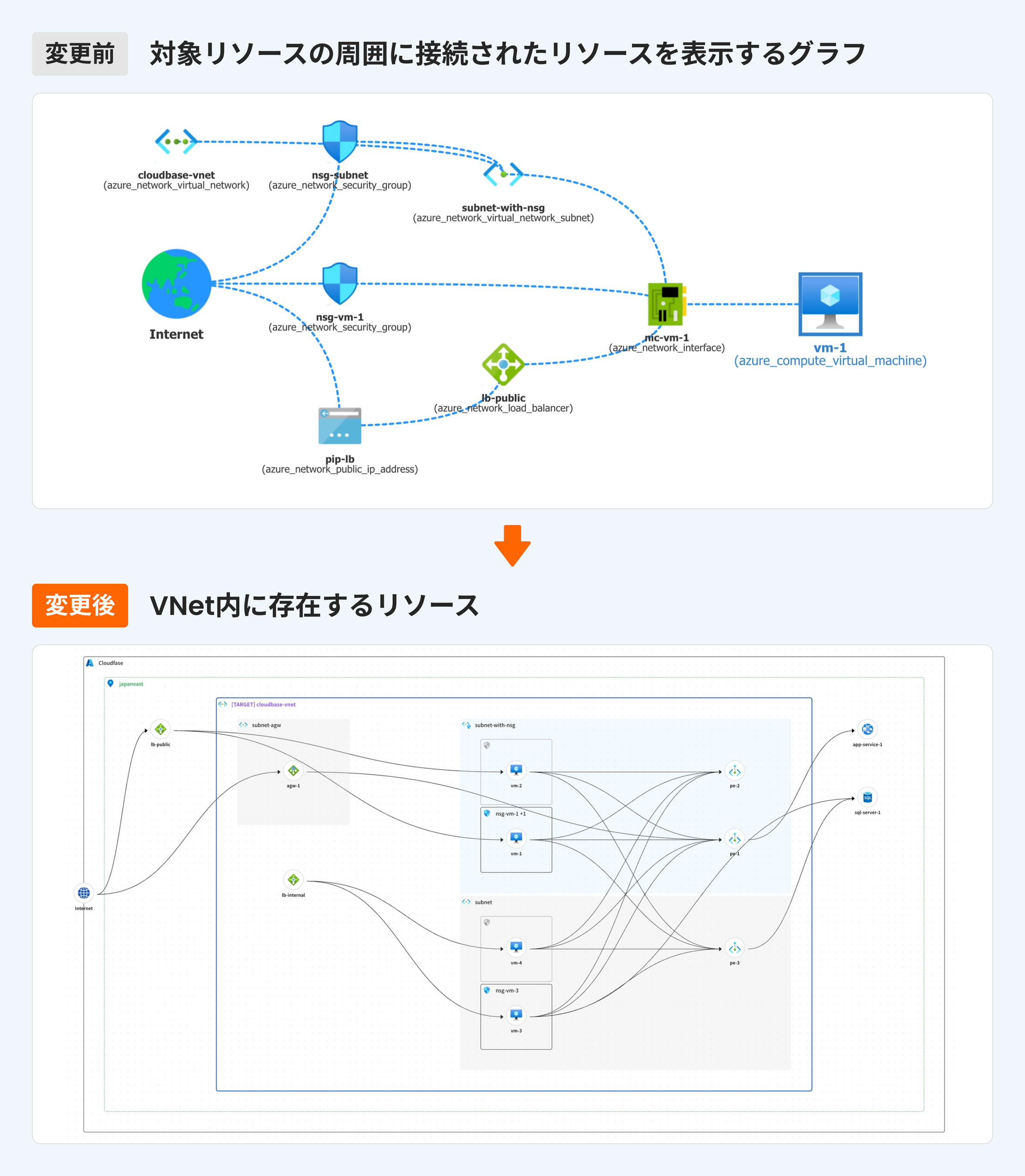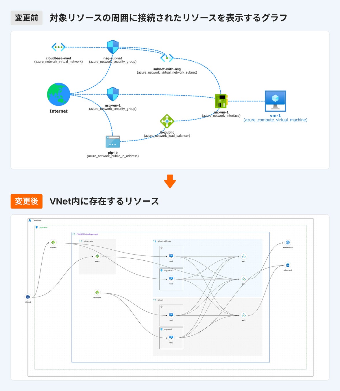 そこでCloudbaseでは、こうしたお客様の運用実態に寄り添い、表示ロジックを抜本的に刷新。Virtual Network(VNet)単位でリソース構成を構造化して表示する形式へと変更しました。