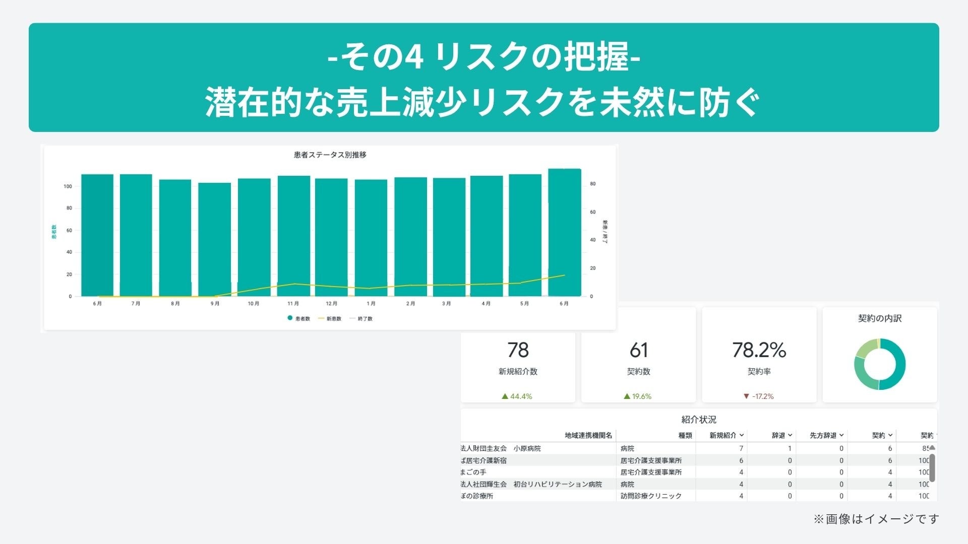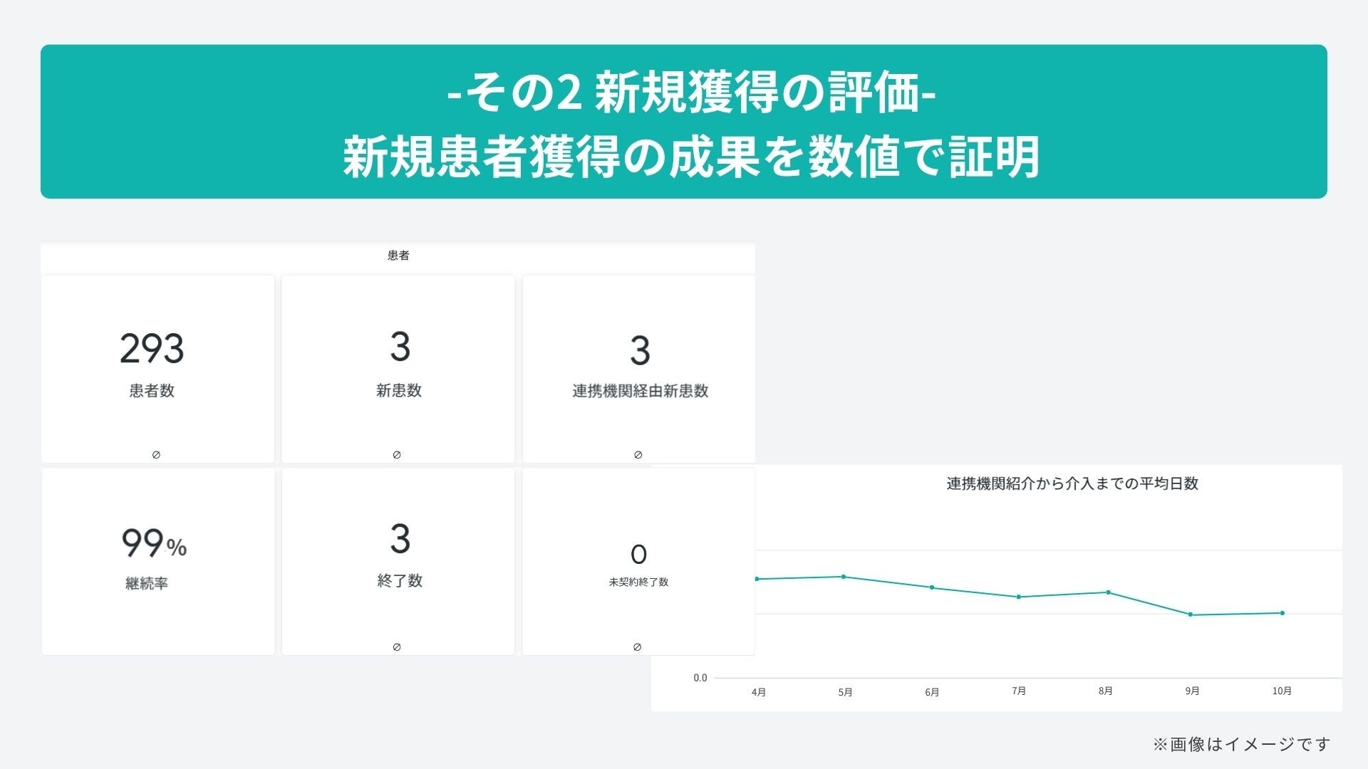 新患数や紹介新患数を追うことで、新しい患者をどれだけ獲得できているか、その傾向を把握できます。さらに、連携機関からの紹介から実際に訪問を開始するまでの日数を自動計測することで、地域におけるクリニックの評価を客観的に判断し、効果的な連携強化につなげられます。