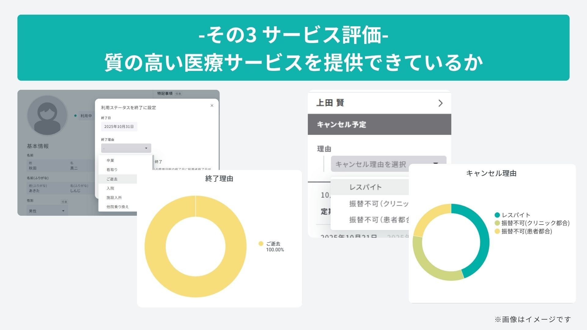 キャンセル理由を詳細に分析し、やむをえないキャンセルだったのか、別日に振り替え不可能だったのかなどを可視化します。これにより、患者様の都合に寄り添う柔軟な診療体制が整っているか、また、売上を維持するための仕組み化ができているかを把握できます。