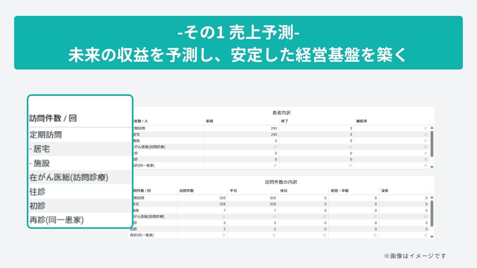 患者数、訪問状況、診療報酬の内訳を可視化することで、クリニック全体の売上が増加傾向にあるか、減少傾向にあるかを一目で把握できます。また、個人宅と施設、包括報酬である在宅がん医療総合診療料(在がん医総)など、収益を構成する患者の内訳を正確に把握できるため、より具体的な売上予測が可能になります。