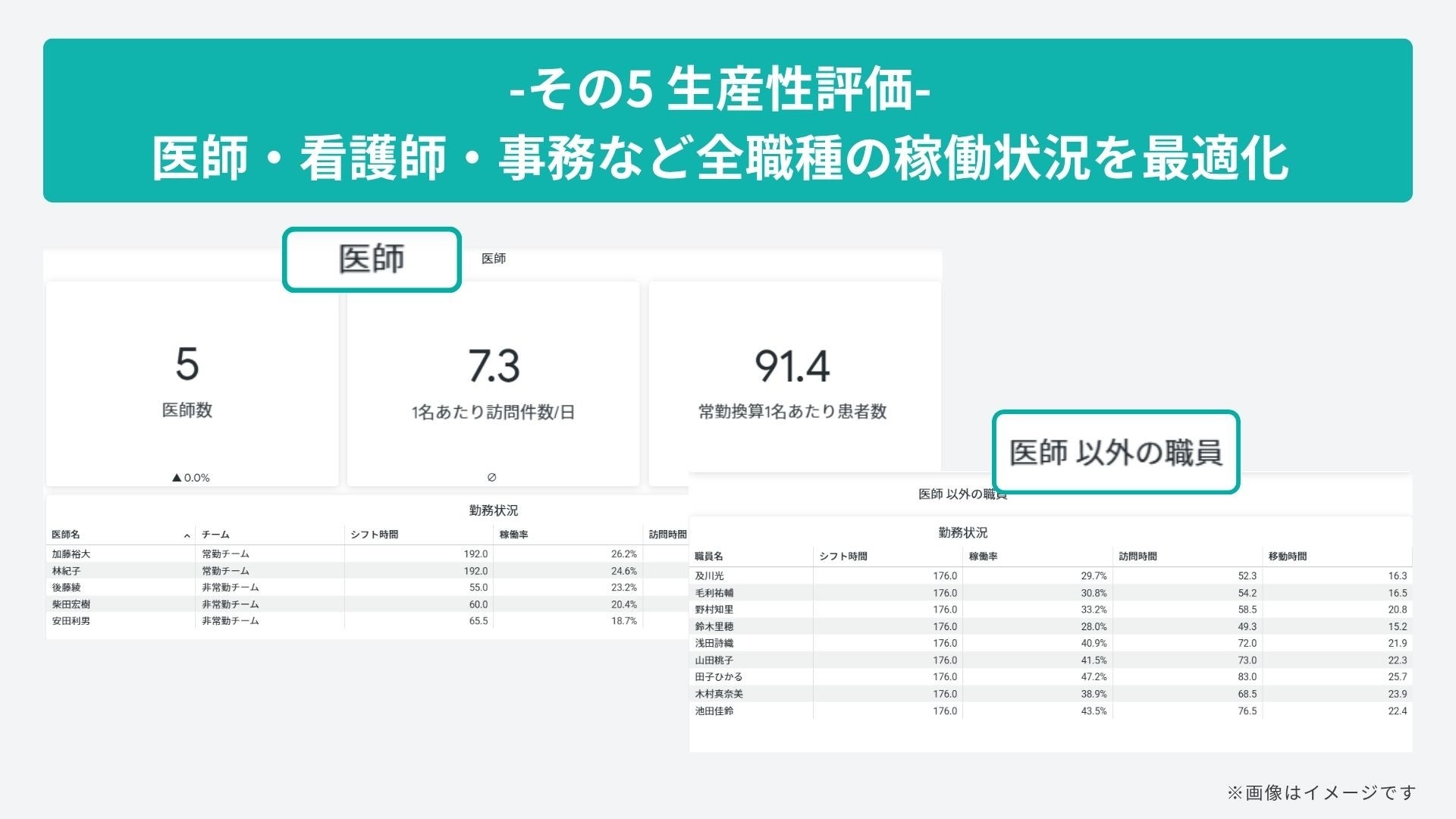 5. 生産性評価:医師・看護師・事務など全職種の稼働状況を最適化