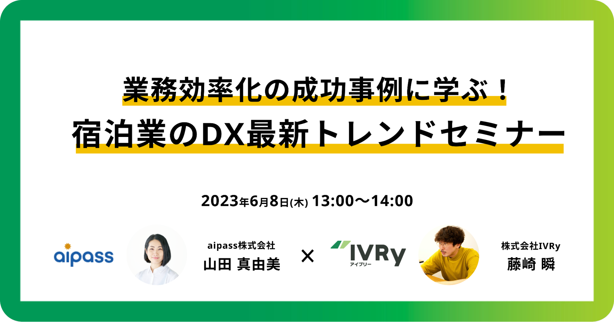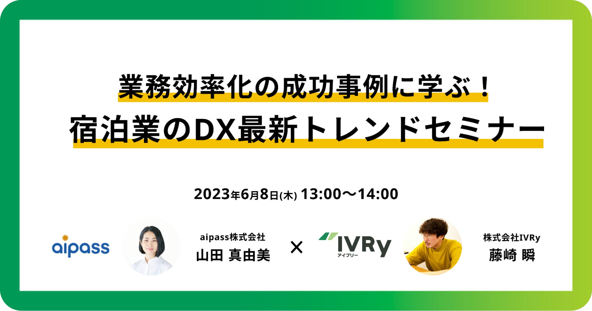 【aipass×IVRy】業務効率化の成功事例に学ぶ!宿泊業のDX最新トレンドセミナーを6月8日(木)13:00に開催!