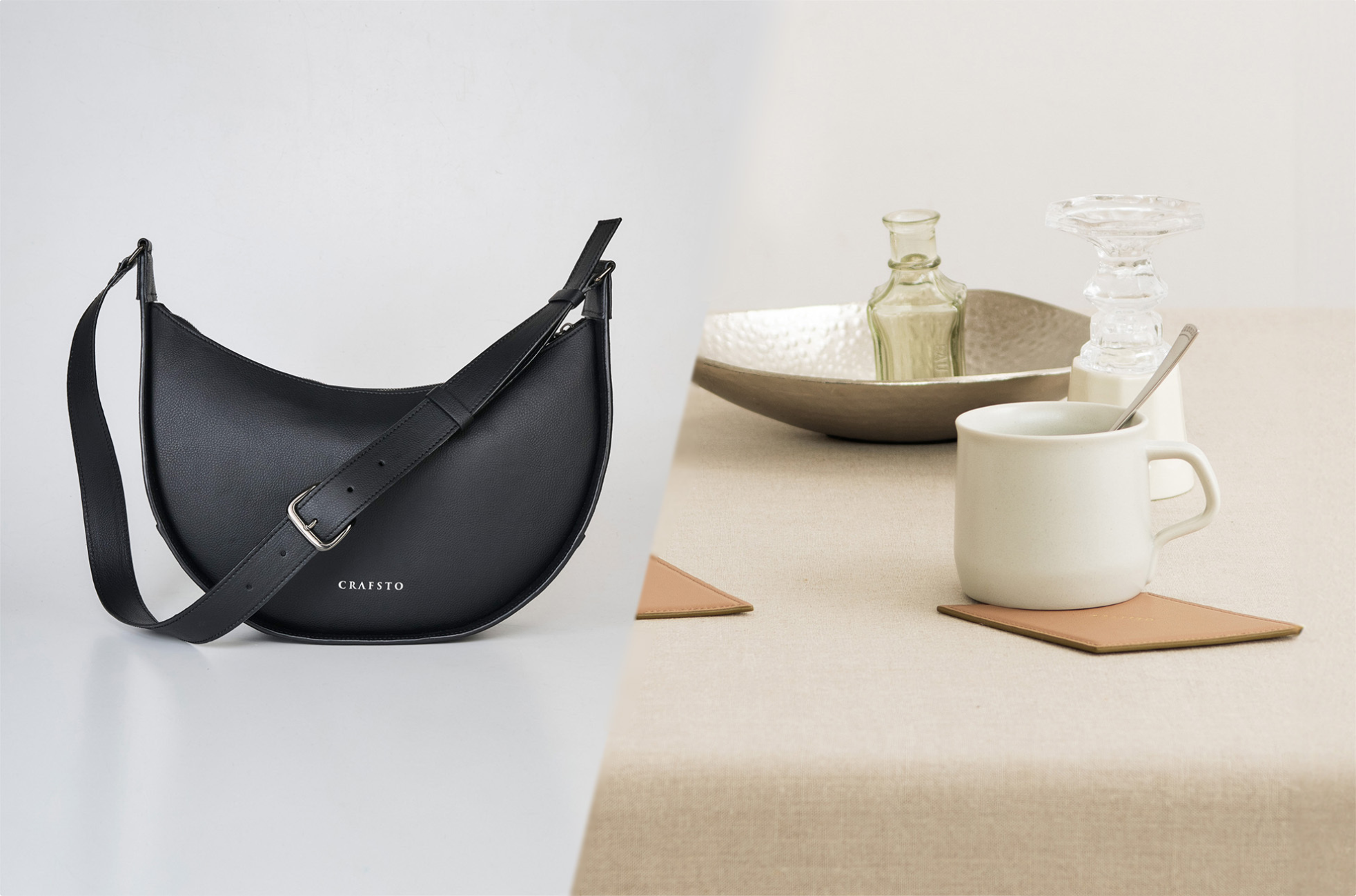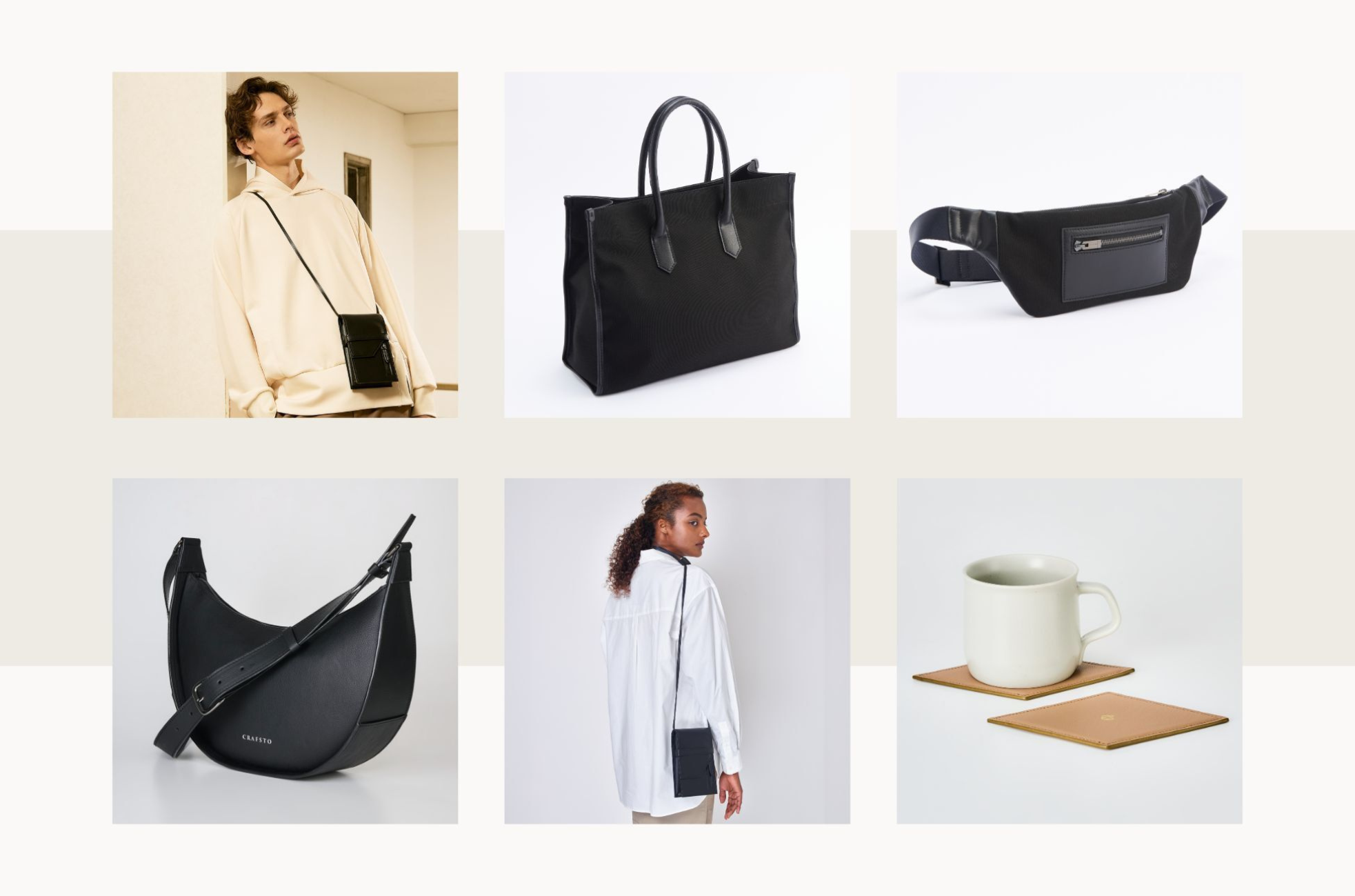 外観の上質さと、傷や水に強い特性を持つアップルレザー製バッグとパズルコースター。長く使用できるミニマルなデザインが揃っているので、パートナーと一緒にリンクコーデを楽しむのも好評です。