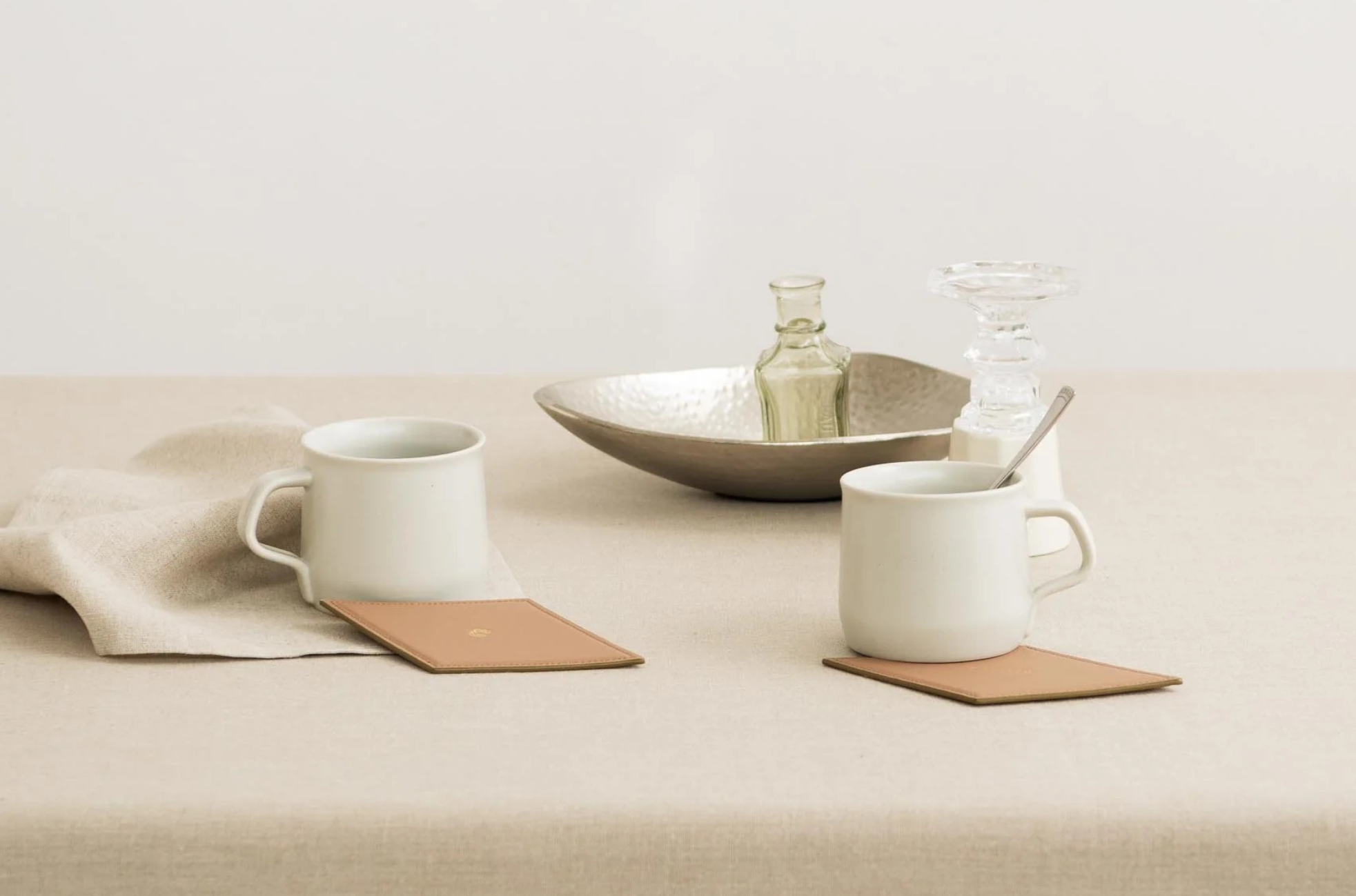 対象商品を購入するともらえるCRAFSTOオリジナルコースターは、ティータイムに役立つのはもちろん、インテリアとして飾っても目を引く菱形のデザインが特徴。抜け感のあるニュートラルカラーと、温かみのある植物性レザーの質感が日常の時間を上質に演出してくれます。