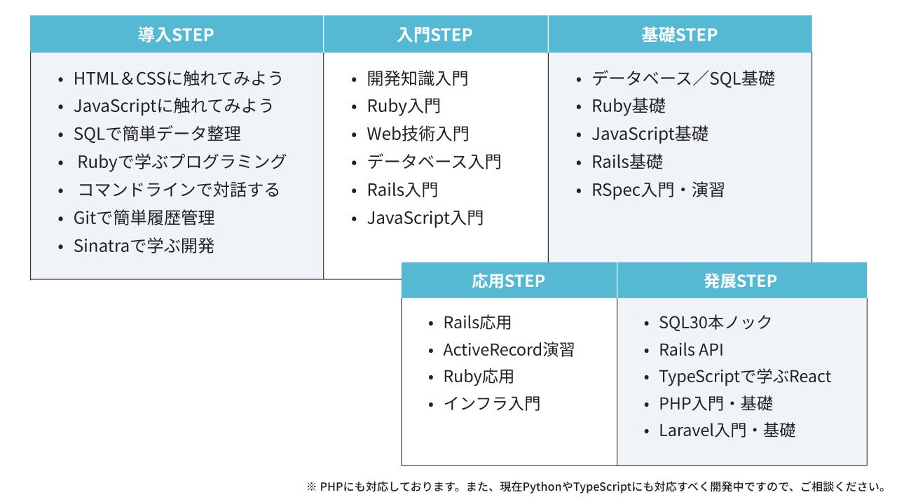 開発会社基準のハイレベルなカリキュラムと長期間の学習で、開発現場が求めるレベルに到達出来る、超実践型エンジニア育成スクール。豊富なシステム開発実績を持つ株式会社スタートアップテクノロジーが開発現場の声を徹底的に取り入れ、Webエンジニアに必要とされる"エンジニアが書いたコードを読み解く力"、"実装方法を自分で考えてコードに落とし込む力"などを実践的に学ぶことが可能です。また、企業文化との価値観のマッチ(カルチャーマッチ)を見据え、RUNTEQ CREDOを指針としたWebエンジニアとして働くためのキャリアトレーニングにも力を入れています。https://runteq.jp/r/d1wbZAFM )