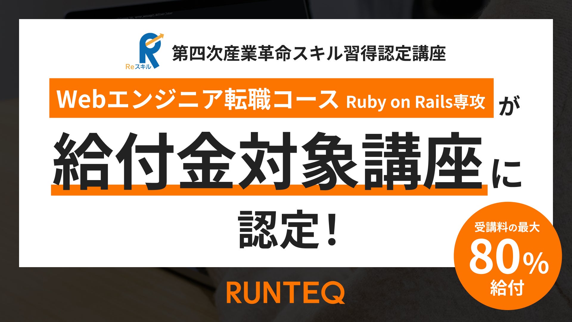 RUNTEQの『Webエンジニア転職コース Ruby on Rails専攻』が専門実践教育訓練給付制度の対象講座に認定されました。