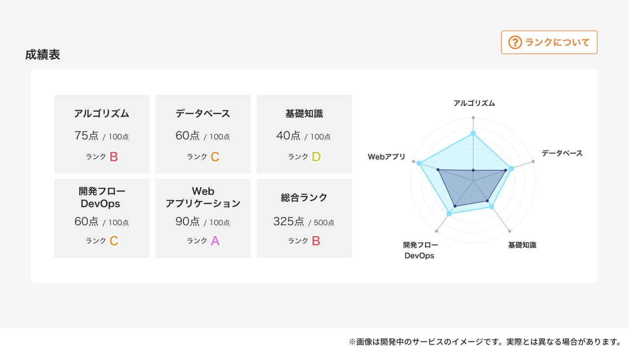 RUNTEQ独自の実践スキルを可視化する「RUNTEQ Skill Metrix」がWebエンジニアとしての実践力を計測します。単なるアルゴリズムや知識だけでなく、以下の5項目を実践形式(AIによるカンニングも防止)で可視化する為、受講前、受講後でどの程度スキルが向上したかが一目瞭然です。