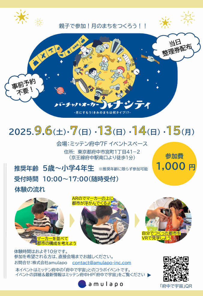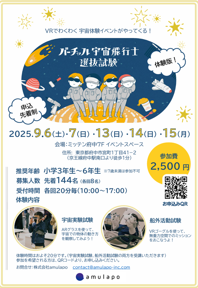 株式会社amulapo(アミュラポ、本社:東京都新宿区、代表取締役:田中克明)は、9月5日(金)よりミッテン府中で開催される「府中で宇宙」にて、宇宙体験イベントを提供いたします。ぜひ、一生の思い出に残る宇宙体験をお楽しみください。