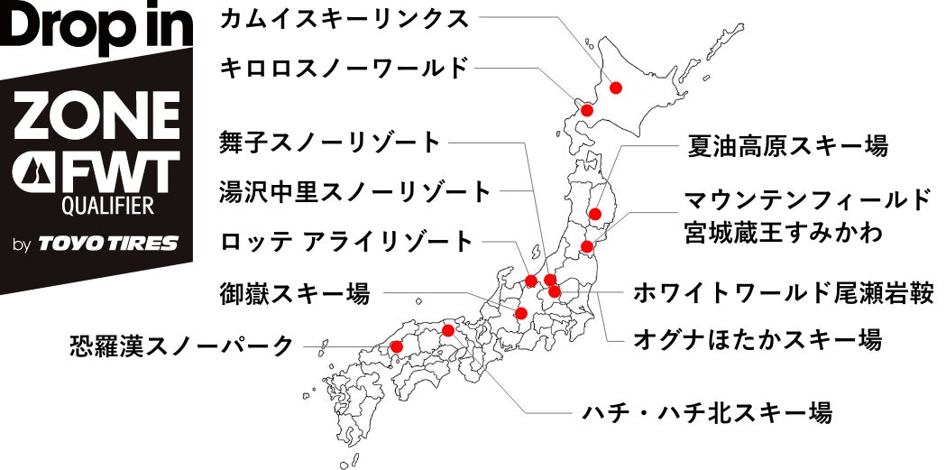 Freeride World Tour (以下、FWT)の日本国内の運営を統括するFWT運営事務局(株式会社Pioneerwork内、本社:東京都台東区、代表:後藤陽一)は、国内大会である、FWT QUALIFIER、FWT JUNIORの開催にあたり、より多くの方に「フリーライド」の魅力を伝えたいと考えています。昨年に引き続き、ゲレンデ内に既に設定されている上級者コースを、フリーライドエリア「ZONE FWT」として包括的にFWT JAPAN認定エリアとすることで、多くの方に「フリーライド」を安全に体験してもらいたいと願っています。今年は開催ゲレンデが2つ増え、全国12箇所のゲレンデでの開催が決定いたしました。また、大会同様、本企画も「TOYO TIRES」にスポンサーとしてFWT JAPANの想いを支えていただくことをご報告いたします。