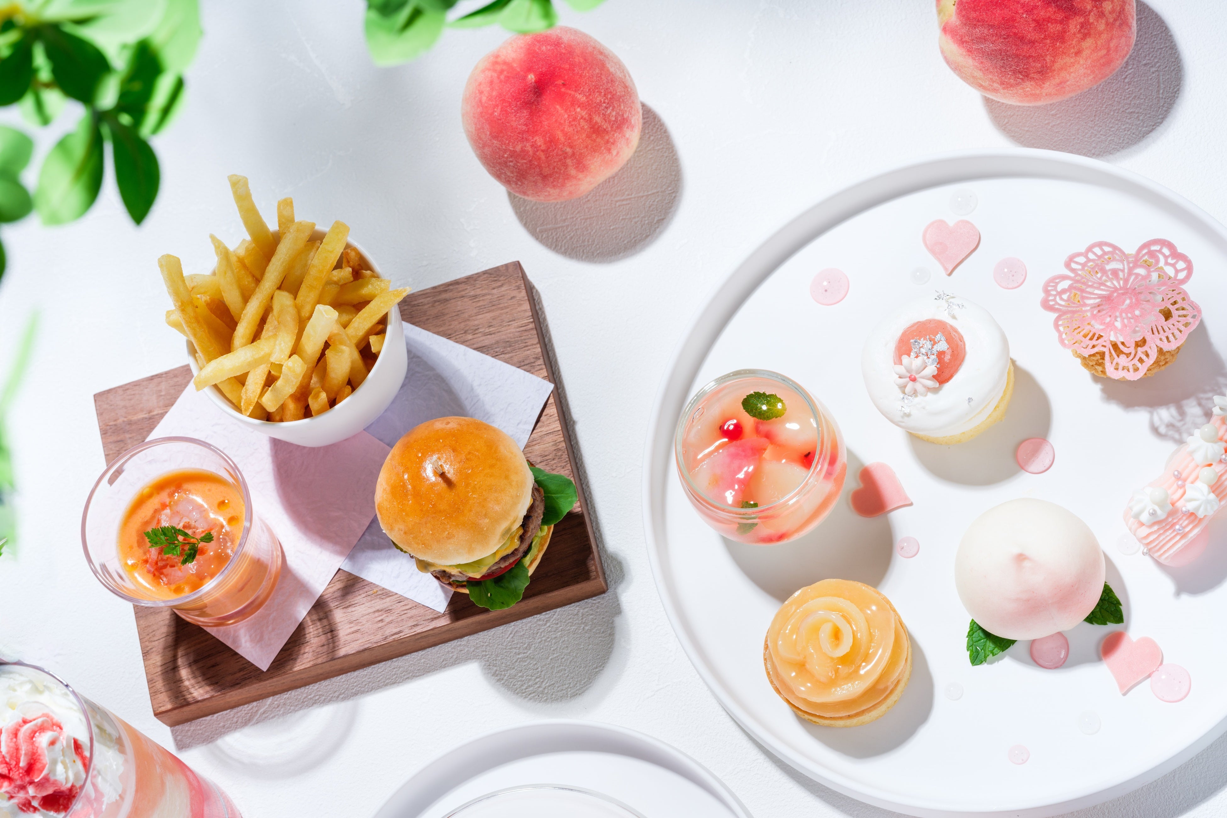この時季ならではの桃を多様にアレンジしたスイーツ7品に加え、セイボリー2品も登場し、バージョンアップしました。スイーツには、爽やかなピーチメルバや、桃とエルダーフラワーのゼリーなど夏に嬉しいグラスデザートをはじめ、フレッシュな果実味を堪能できるタルトやショートケーキも。小山芳月堂によるお団子には可愛いアクセントを添えるほか、シェフ特製のガスパチョとミニバーガーといったセイボリーアイテムまで、充実のセレクションが揃います。夏休みの昼下がりにご自身へのご褒美として、またはブランチ代わりとしてもおすすめです。