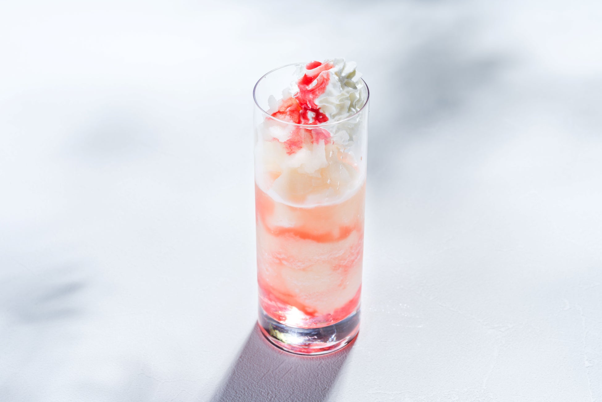 桃のジュレと桃のフローズンに、ホイップクリームをトッピングし、ピンクのマーブル模様で美しく仕上げました。シャーベットにピーチリキュールを入れたアルコールバージョンもご用意可能。
